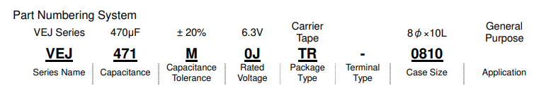 - 额定电压:以伏特(V)为单位,“0J”表示6.3V。